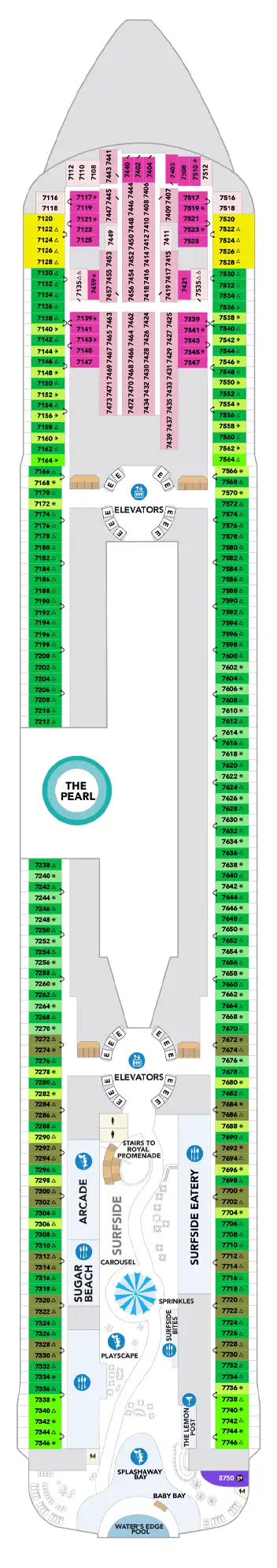 Exclusive Star Class amenities Exclusive access to the Suite Sun Deck Exclusive access to Royal Genie service All-day access to Coastal Kitchen Complimentary specialty restaurants Complimentary premium beverage packages (for guests 21 years and older) Complimentary Royal replenishment package (for guests under 21) Gifts Free VOOM